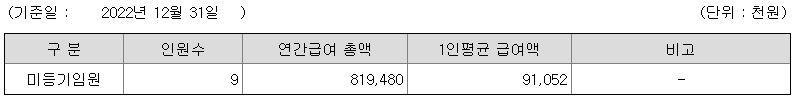 미등기임원의 평균연봉은 9105만원이고 직원수는 9명입니다.