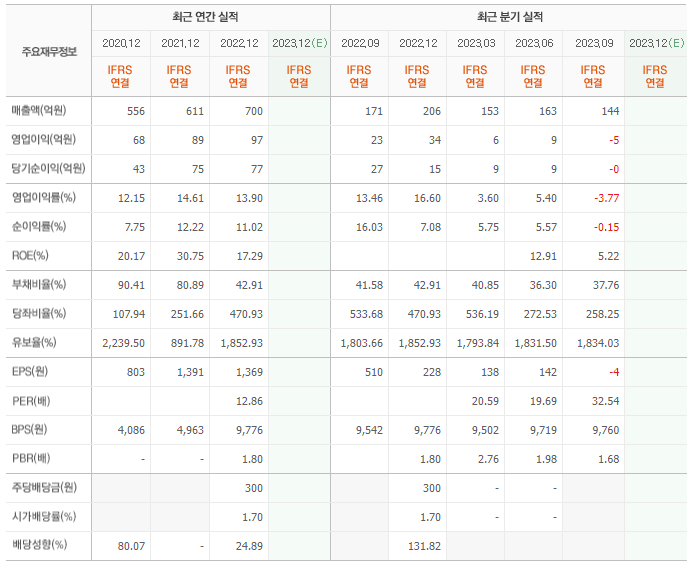 2022년 매출은 700억, 영업이익은 97억, 당기순이익은 77억입니다. 그리고 영업이익률은 13.90%입니다.