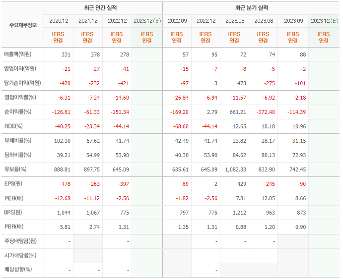 2022년 매출은 278억, 영업이익은 -41억, 당기순이익은 -421억입니다. 그리고 영업이익률은 -14.60%입니다.