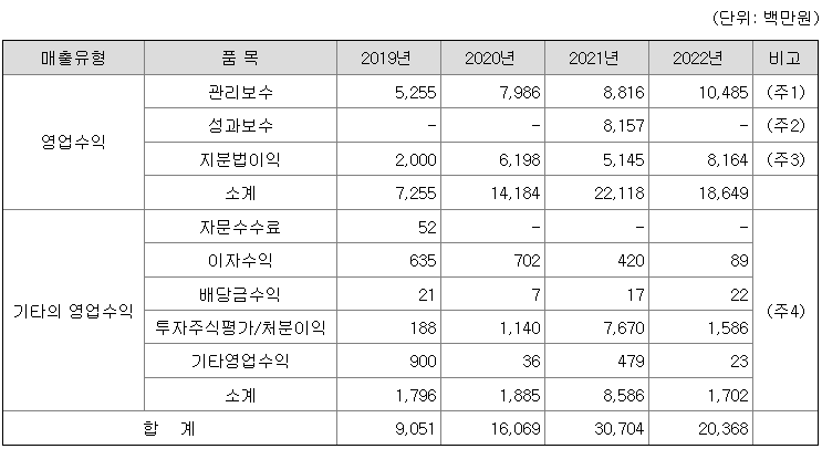 당사는 한국표준산업분류상 ‘(K64209)기타 금융 투자업’에 속하는 회사로서 신기술사업금융업을 영위하고 있습니다.