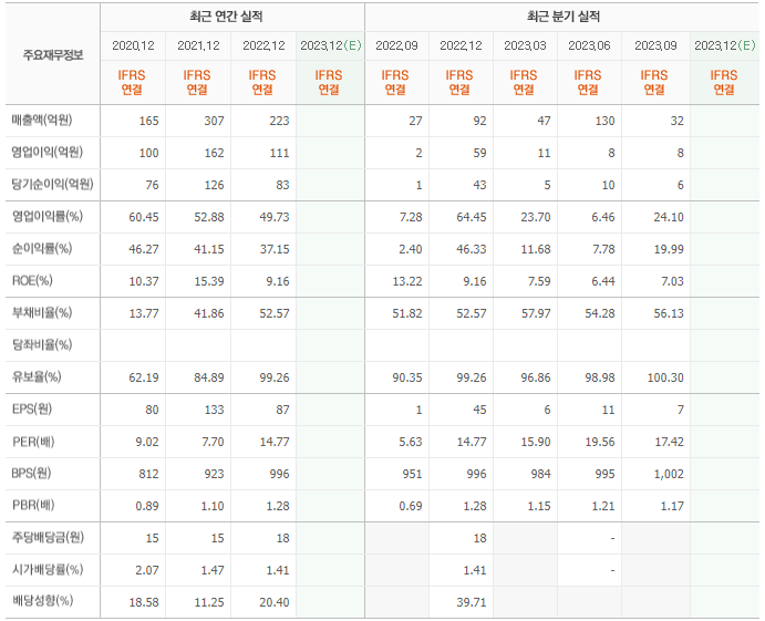 2022년 매출은 223억, 영업이익은 111억, 당기순이익은 83억입니다. 그리고 영업이익률은 49.73%입니다.