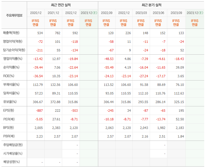 2022년 매출은 592억, 영업이익은 -118억, 당기순이익은 -134억입니다. 그리고 영업이익률은 -19.84%입니다.