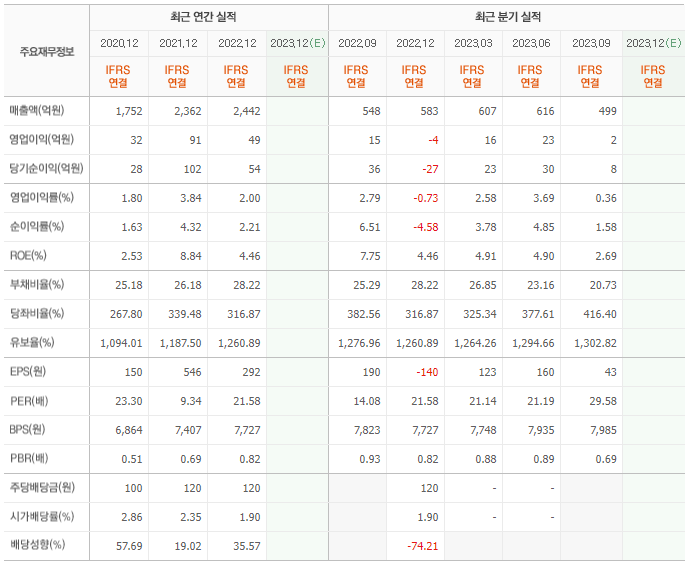 2022년 매출은 2442억, 영업이익은 49억, 당기순이익은 54억입니다. 그리고 영업이익률은 2.00%입니다.