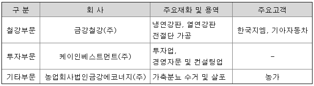 회사는 자동차, 가전, 건설, 산업용기 등의 산업원자재인 코일을 자동화 기계설비를 갖추고 수요자가 원하는 규격으로 전 ·절단 가공하여 공급하는 것을 주요사업으로 영위하고 있습니다.