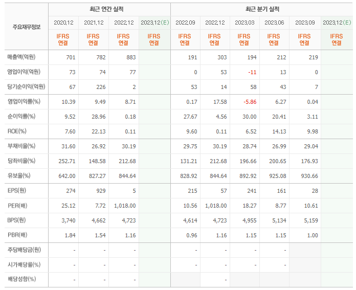 2022년 매출은 883억, 영업이익은 77억, 당기순이익은 2억입니다. 그리고 영업이익률은 8.71%입니다.
