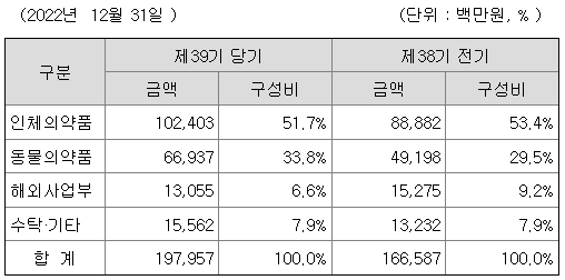 당사의 사업부문은 크게 전문의약품, 비급여의약품(비만 & 웰빙주사), 동물의약품 등으로 구성되어 있습니다. 회사의 주요생산품목 중 전문의약품은 만성 질환군으로 대표되는 고혈압, 이상지질혈증, 당뇨에 대한 대사성 질환과 소화성 궤양치료제에 보다 역량을 집중하고 있으며, 당뇨와 연관성이 있는 비만치료제에 대한 지속적인 연구개발과 치매, 파킨슨병 등에 까지 영역을 넓혀가고 있습니다. 웰빙주사는 통증을 포함하여 비타민, 미네랄, 싸이모신알파 등 면역증강제의 보강 및 다양한 적응증의 주사제 라인업에 힘쓰고 있으며, 또한 백신사업 및 환자의 QOL을 위한 다양한 건강기능식품의 영역으로까지 사업의 다각화를 꾀하고 있습니다.