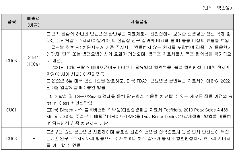 당사는 혈관내피기능장애 차단제 개발의 혁신 플랫폼 기술인 SOLVADYS® 플랫폼 기술을 이용한 First-in-Class 신약후보물질을 개발하고 파트너사와의 공동연구 또는 기술이전을 사업화 모델로 하고 있어 제품 판매에 대한 매출은 존재하지 아니합니다. 다만, 라이선스 계약에 따른 초기 기술료(Upfront), 개별 단계별 마일스톤(Milestone), 판매액에 대한 로열티와 임상연구비용 및 제반비용 등을 수익으로 인식하고 있습니다. 당사는 2021년 10월 떼아오픈이노베이션에 기술 이전한 CU06에 대하여 계약금(Upfront)을 수령하였습니다.