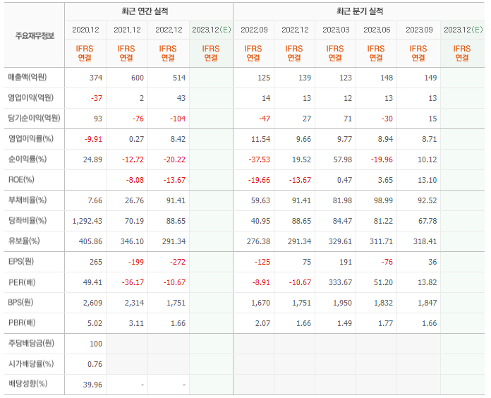 2022년 매출은 514억, 영업이익은 43억, 당기순이익은 -104억입니다. 그리고 영업이익률은 8.42%입니다.