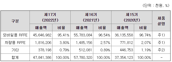 당사는 이동통신용 단말기에 탑재되는 전력증폭기 모듈(Power Amplifier Module, 약칭 PAM) 개발, 제조 및 판매를 주사업으로 하고 있습니다. PAM은 이동 단말의 전력사용 효율성과 통화시간을 좌우하는 핵심부품으로서 이동통신용 단말기 송신부의 미약한 신호를 증폭하여 안테나를 통해 기지국까지 송출하는 전력증폭 역할을 하는 부품이며, 단말기 하나에 반드시 하나 이상이 필요한 필수 부품입니다.