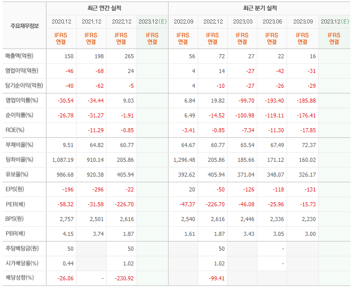 2022년 매출은 265억, 영업이익은 24억, 당기순이익은 -5억입니다. 그리고 영업이익률은 9.03%입니다.