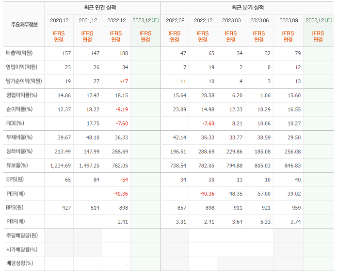 2022년 매출은 188억, 영업이익은 34억, 당기순이익은 -17억입니다. 그리고 영업이익률은 18.15%입니다.