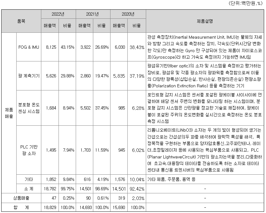 주식회사 파이버프로의 주요 제품과 서비스별 매출액 및 총매출액에서 차지하는 비율은 다음과 같습니다.