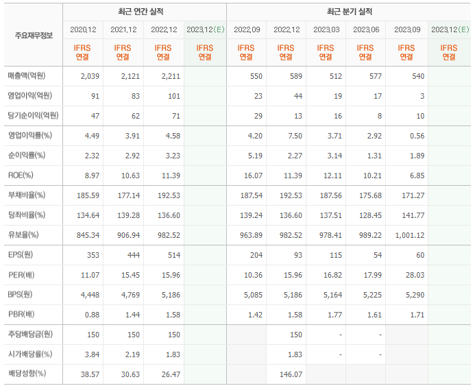 2022년 매출은 2211억, 영업이익은 101억, 당기순이익은 71억입니다. 그리고 영업이익률은 4.58%입니다.