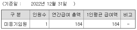 미등기임원의 평균연봉은 1억 8400만원이고 직원수는 1명입니다.