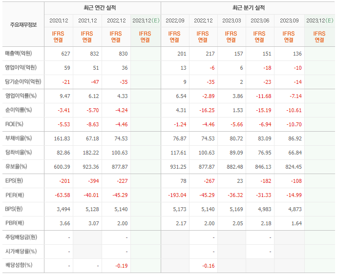 2022년 매출은 830억, 영업이익은 36억, 당기순이익은 -35억입니다. 그리고 영업이익률은 4.33%입니다.
