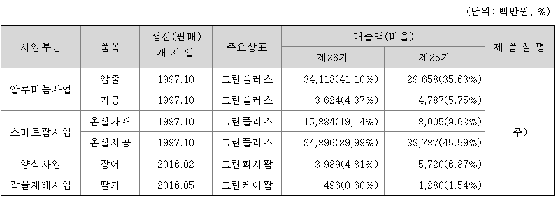 당사의 주요 사업은 알루미늄사업과 스마트팜사업부문으로 구분되며, 건축용과 산업용으로 사용되는 알루미늄 압출제품의 생산 및 판매와 국내에서 성장산업으로 주목받는 스마트팜의 보급 확대를 목표로 하고 있습니다. 당사는 알루미늄 압출 생산라인을 기반으로 첨단온실의 기획부터 설계 자재 제작과 시공까지 첨단온실사업의 전 영역을 대응할 수 있는 역량을 보유하고 있으며, 이를 바탕으로 한국형 스마트팜 보급을 선도하는 기업으로 성장하는 것을 목표로 하고 있습니다.