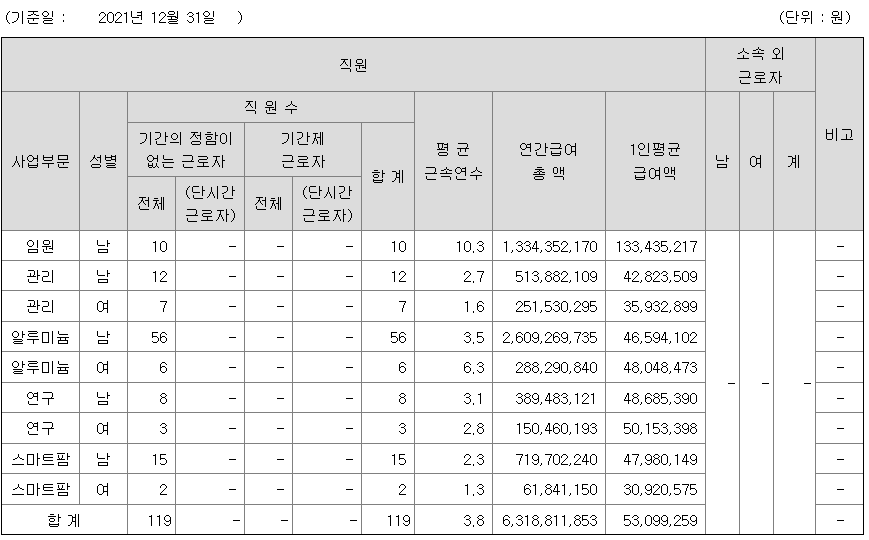 미등기임원의 평균연봉은 1억 5만원이고 직원수는 5명입니다.