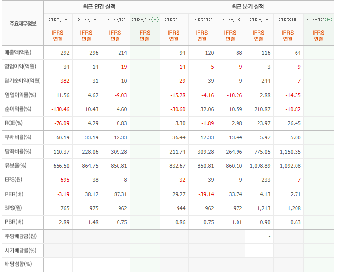 2022년 매출은 214억, 영업이익은 -19억, 당기순이익은 10억입니다. 그리고 영업이익률은 -9.03%입니다.