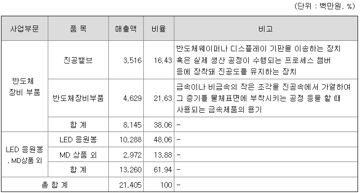 반도체장비부품 부문은 반도체 공정에 필요한 진공Chamber와 해당 Chamber에 필요한 특수 진공 밸브를 생산 및 판매하는 사업을 영위하고 있습니다.