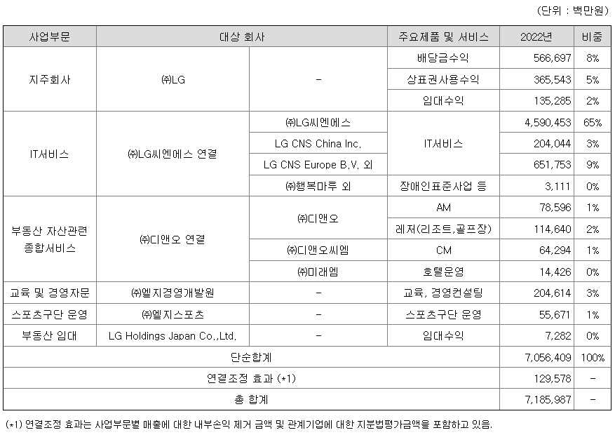 연결회사내 주요 제품 및 서비스는 IT서비스업(LG씨엔에스), 부동산 자산관련 종합서비스업(디앤오), 경제·경영 등 교육 및 자문서비스업(LG경영개발원), 스포츠서비스업(LG스포츠), 부동산 임대업(LG Holdings Japan Co.,Ltd.)이 있습니다.