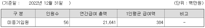 미등기임원의 평균연봉은 3억 8400만원이고 직원수는 56명입니다.