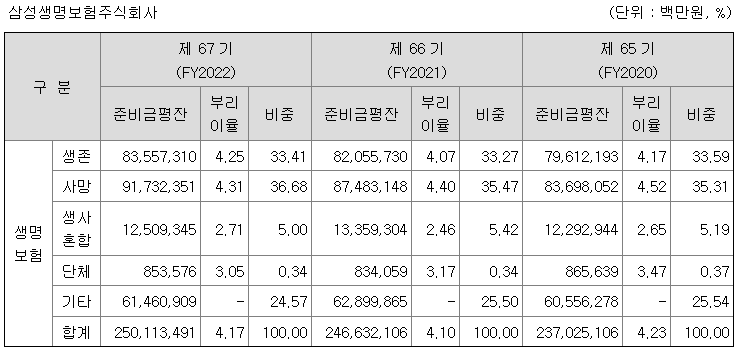 이에 따른 2022년 기말 누적 기준 준비금 평잔은 250조 1,135억 입니다.