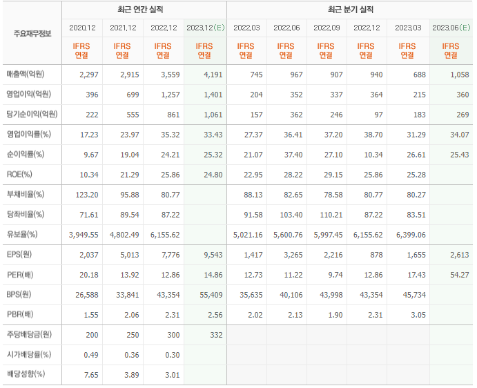 2022년 실적은 3559억, 영업이익은 1257억입니다. 그리고 영업이익률은 35.32%입니다.