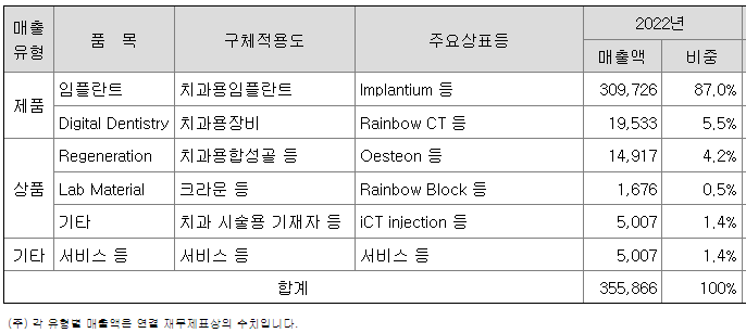 임플란트 시장의 트렌드 변화로 인해 단순히 임플란트만 제공하던 과거의 판매방식에서 벗어나 임플란트와 디지털 장비 등을 Total Solution 개념으로 제공하기 위해 디지털을 이용한 CBCT, CAD/CAM 등의 Digital 제품을 자체 기술로 개발하여 판매중입니다. 당사는 설립부터 현재까지 투자된 연구개발의 매출 가시화가 본격화되고 있는 단계이며, 향후 1~2년은 국내 시장 장악력 확대 및 공고화, 그리고 중국 및 아시아, 중동시장을 중심으로 판매를 확대해 나갈 계획입니다.