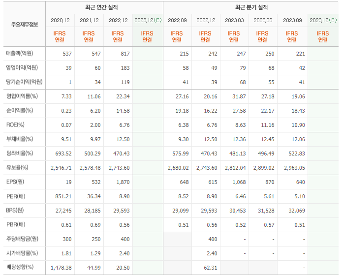 2022년 매출은 817억, 영업이익은 183억, 당기순이익은 119억입니다. 그리고 영업이익률은 22.34%입니다.