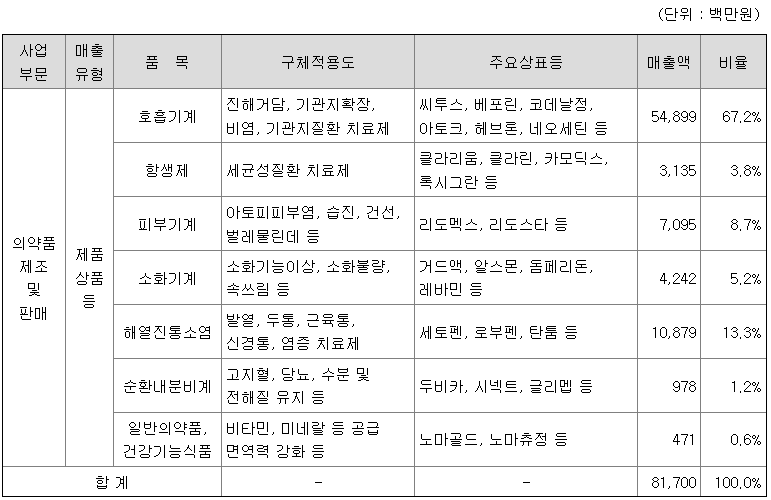 당사는 의약품의 제조 및 판매를 주요 사업으로 하며 호흡기계, 피부기계, 해열진통소염제, 소화기계, 항생제, 순환내분비계, 일반의약품 및 건강기능식품을 제조 및 판매하고 있습니다.