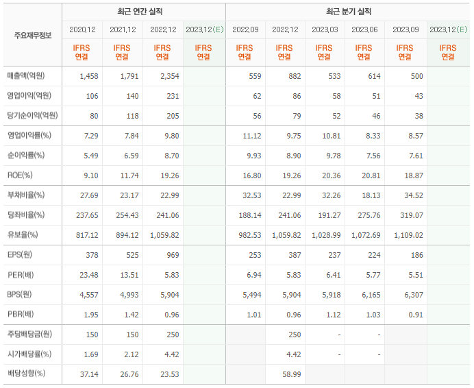 2022년 매출은 2354억, 영업이익은 231억, 당기순이익은 205억입니다. 그리고 영업이익률은 9.80%입니다.