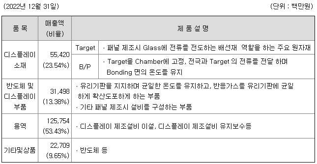 당사는 디스플레이 제조공정중 증착공정의 박막형성 및 디스플레이 Panel 제조공정중 증착공정에서 필요한 배선재의 재료인 타겟과 관련 부품인 Backing Plate, 디스플레이 공정장비 부품을 연구개발생산하는 사업을 영위하고 있습니다.