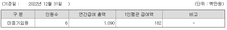 미등기임원의 평균연봉은 1억 8200만원이고 직원수는 6명입니다.