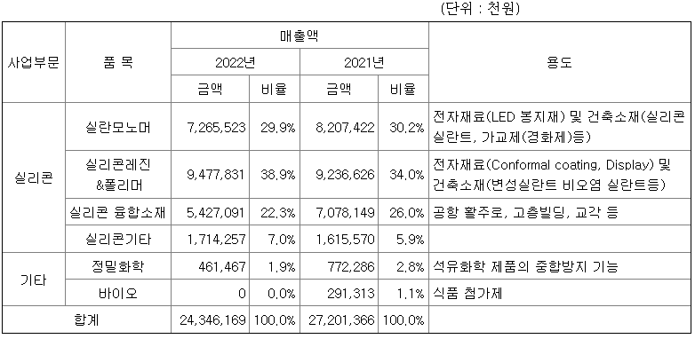 사업보고서 기준일 현재 사업부분별 매출액은 실리콘 소재 사업 23,885백만원(98.1%), 정밀화학 사업 461백만원(1.9%)이며, 당사의 주요거래처는 바커케미칼코리아, wacker chemical corporation, Dow, KCC실리콘, LG화학등이 있습니다.