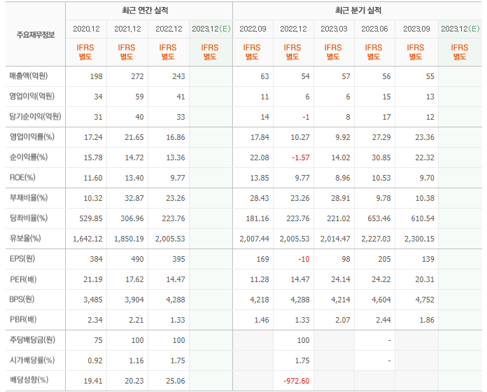 2022년 매출은 243억, 영업이익은 41억, 당기순이익은 33억입니다. 그리고 영업이익률은 16.86%입니다.