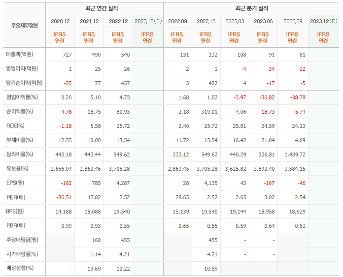 2022년 매출은 540억, 영업이익은 26억, 당기순이익은 437억입니다. 그리고 영업이익률은 4.73%입니다.