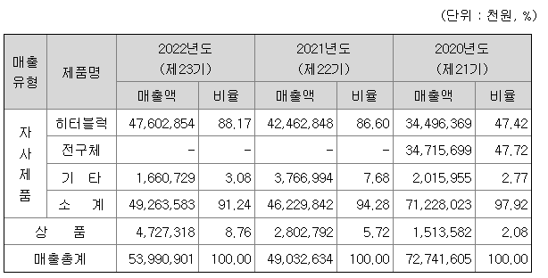 당사는 2022년 매출액 540억원, 영업이익 26억원, 당기순이익 437억원을 기록했습니다. 전기 대비 매출액은 10% 증가, 영업이익은 2% 증가하였습니다. 당기순이익 중 계속영업이익은 17억원, 중단영업이익은 420억원입니다. 계속영업이익은 전기 대비 당사의 주요제품에 대한 시장점유율을 명확히 산정할 수는 없지만, 메탈히터블럭의 당사의 시장점유율은 국내 삼성전자 및 SK하이닉스 기준으로 90%이상을 견고하게 기록하고 있습니다.