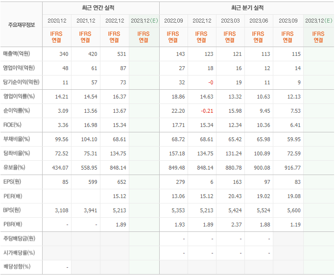2022년 매출은 531억, 영업이익은 87억, 당기순이익은 73억입니다. 그리고 영업이익률은 16.37%입니다.