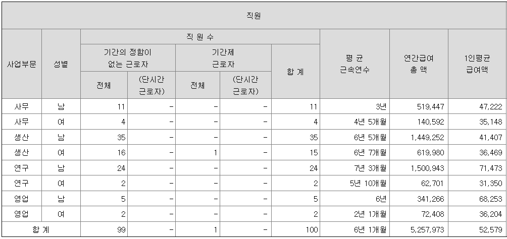 전체 평균연봉은 5257만원이고 직원수는 100명입니다.