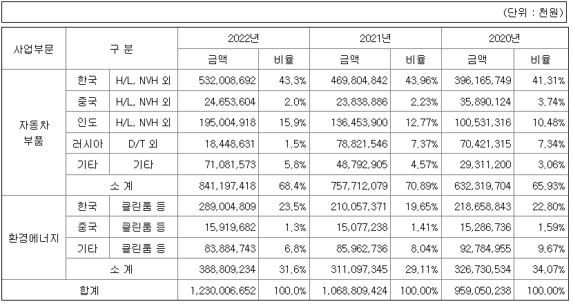당사는 ODM(생산자 개발방식)으로 납품이 이루어지는 자동차 부품 중 내장재 부품(HEADLINER, NVH부품, DOOR TRIM 등)의 생산 및 공급을 사업 목적으로 설립되어, 현재 국내에서는 내장재 부품 및 엔진룸 흡차음재 부품 사업 부문을, 그리고 해외법인은 내장재 부품 사업 부문을 영위하고 있습니다.