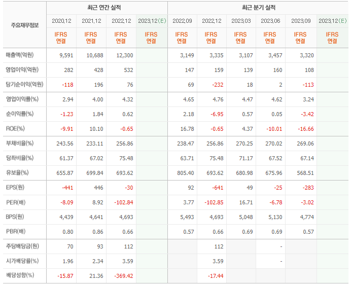 2022년 매출은 1조 2300억, 영업이익은 532억, 당기순이익은 76억입니다. 그리고 영업이익률은 4.32%입니다.