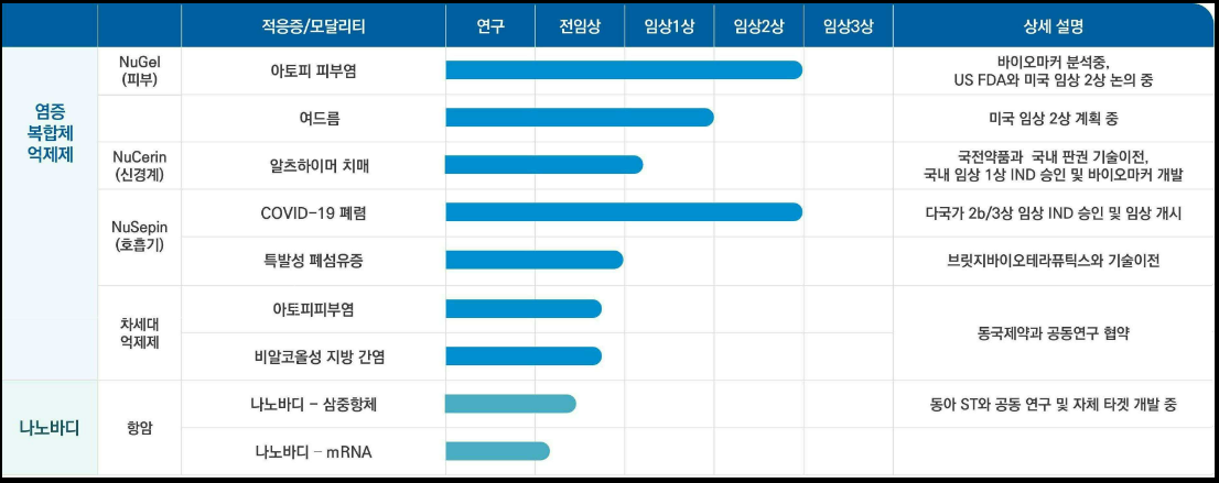 당사는 세계 최초로 개발한 GPCR19-P2X7-NLRP3 염증복합체 억제제 플랫폼 및 기존 항체 치료의 미충족 수요를 충족시킬 수 있는 나노바디 항체 개발 플랫폼을 보유한 신약 연구개발 전문 바이오 벤처기업입니다. 유럽 식품의약품안전처 (EMA) 허가 아래 루마니아의 5개 센터에서 COVID-19 폐렴 치료제에 대한 임상2상을 성공적으로 완료하였고 치료제로의 높은 가능성을 인정받아 국가신약개발재단(KDDF)으로부터 바이오벤처사로서는 큰 규모인 91억원의 임상 개발비를 지원받아 다국적 2b/3상 임상을 수행하고 있습니다. 국내5개 대형 의료기관에서 아토피 치료제에 대한 임상2상의 환자 등록을 완료하여 바이오마커 분석 중에 있으며 알츠하이머 치매 임상 1상을 진행중에 있습니다.