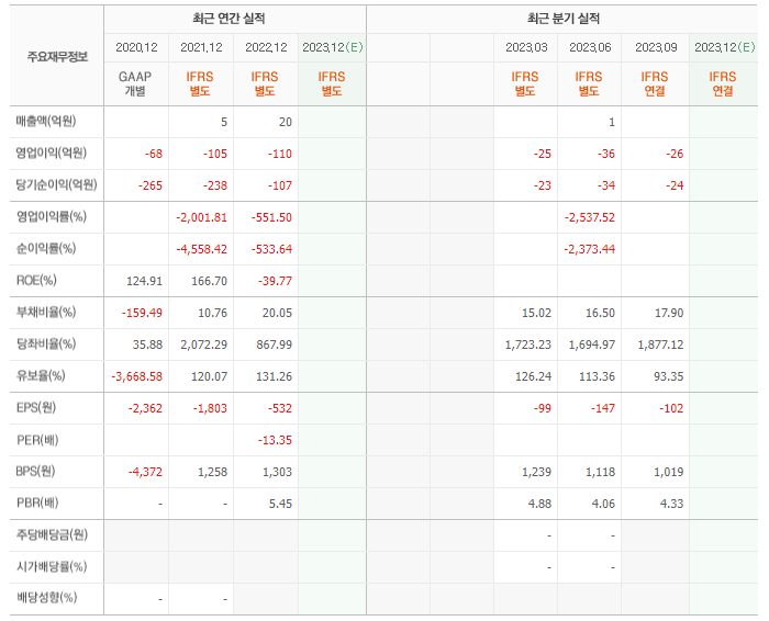 2022년 매출은 20억, 영업이익은 -110억, 당기순이익은 -107억입니다. 그리고 영업이익률은 -551.50%입니다.