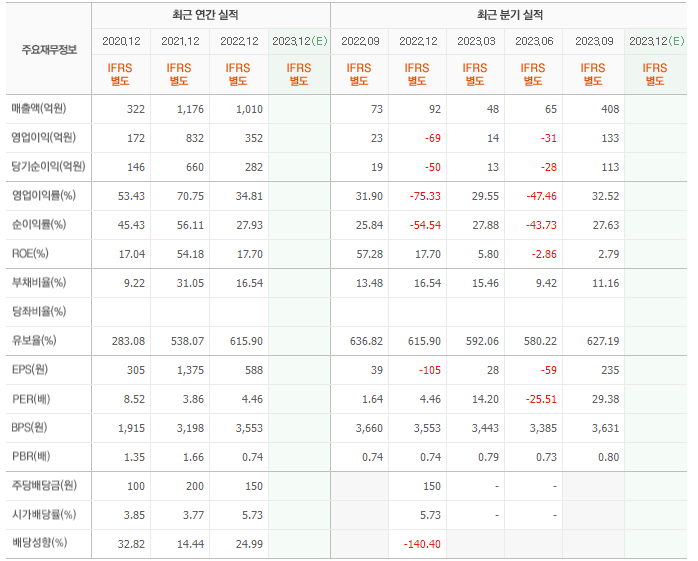 2022년 매출은 1010억, 영업이익은 352억, 당기순이익은 282억입니다. 그리고 영업이익률은 34.81%입니다.