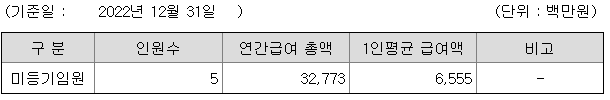 미등기임원의 평균연봉은 65억 5500만원이고 직원수는 5명입니다.