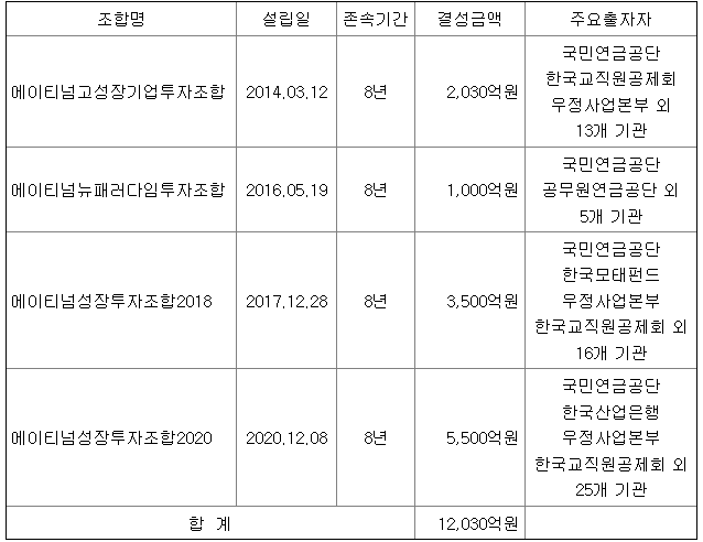 보고서 제출일 현재 당사는 4개 투자조합, 약 1조2,030억원의 운용자산을 운용중에 있습니다. 에이티넘인베스트먼트는 중소벤처기업부에서 매년 실시하는 창업투자회사 평가가 실시된 이래 현재까지 연속하여 최우수등급을 획득하여 운용 성과뿐만 아니라 투명성, 위험 관리 등의 우수성을 증명하였습니다.또한 정부 및 주요 출자자들로부터 베스트 벤처캐피탈상, 우수펀드운용상 등을 수상하며 탁월한 운용 성과와 투명한 운용 체계에 있어서 대외적으로 인정을 받은 바 있습니다. 당사의 주요 출자자는 국내 주요 연기금을 포함한 각종 금융기관 및 정부기관으로 구성되어 있습니다.