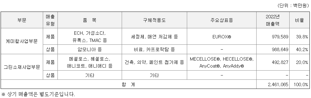 그린소재사업부는 셀룰로스계열 제품으로 구성되어 있으며 글로벌 경쟁우위에 있는 고부가 제품을 생산하고 있으며, 증설을 통하여 지속 성장하고 있습니다. 셀룰로스 계열 제품은 산업용과 식의약용으로 구분되며, 산업용으로는 건축용 물성 향상 및 세라믹 필터 첨가제인 메셀로스, 수용성 페인트 및 퍼스너 케어 첨가제 헤셀로스가 있으며 식의약용으로는 의약용 부형제로 캡슐, 코팅용 첨가제인 애니코트, 식품용인 애니애디가 있으며 이들 제품은 건축, 코팅, 의약, 식품 등 광범위한 산업분야에서 널리 사용되고 있습니다. 매출총액 기준 매출액 비율은 산업용(메셀로스, 헤셀로스) 14%, 식의약용(애니코트, 애니애디) 6% 등입니다.