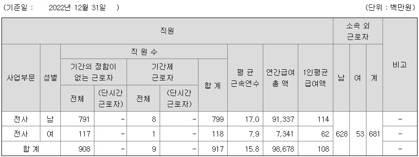 | 사업부문 | 성별 | 직원수 | 평균근속연수 | 평균연봉(백만) |