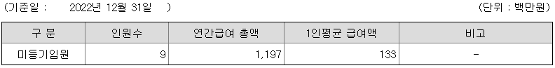 미등기임원의 평균연봉은 1억 3300만원이고 직원수는 9명입니다.