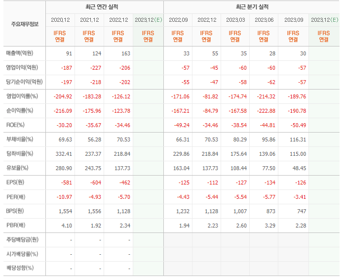 2022년 매출은 163억, 영업이익은 -206억, 당기순이익은 -202억입니다. 그리고 영업이익률은 -126.12%입니다.
